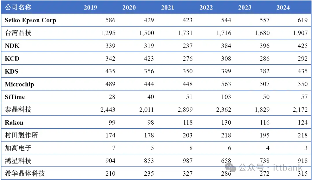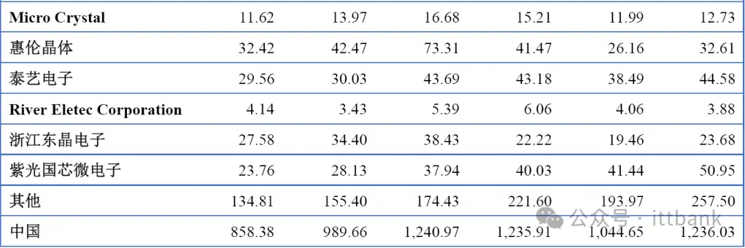 中国市场主要厂商晶体和振荡器销量(2019-2024)&(百万只)