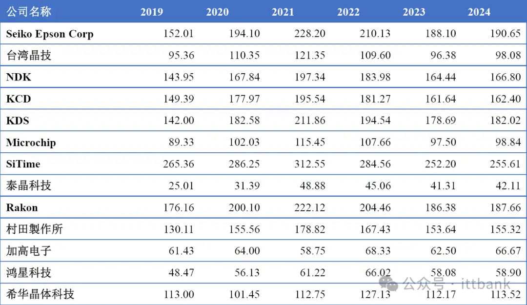 全球市场主要厂商晶体和振荡器销售价格(2019-2024)&(美元/千只)