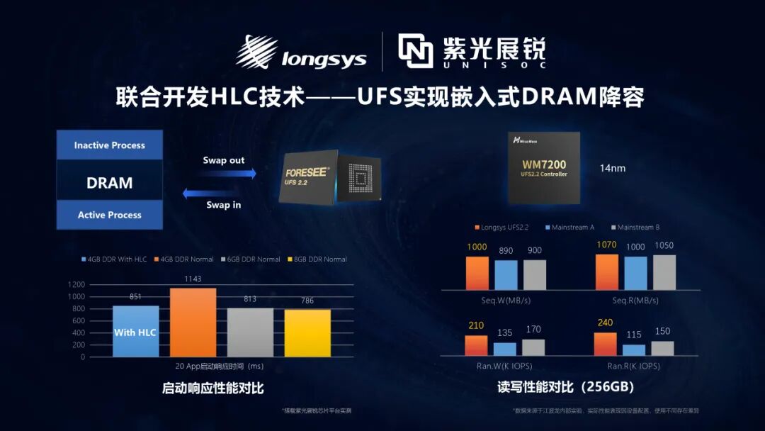 在嵌入式端,江波龙与紫光展锐联合开发,搭载紫光展锐芯片平台实测,4GB DDR搭配HLC技术后,20款App启动响应时间仅851ms,接近6GB/8GB DDR正常配置水平,且江波龙搭载14nm制程工艺WM7200主控的UFS 2.2产品,顺序读写最高可达1070MB/s、1000MB/s,随机读写IOPS分别最高可达240K、210K,超过行业主流水平,在保障流畅体验和器件使用寿命的前提下,有效降低终端DRAM容量需求、优化BOM成本。